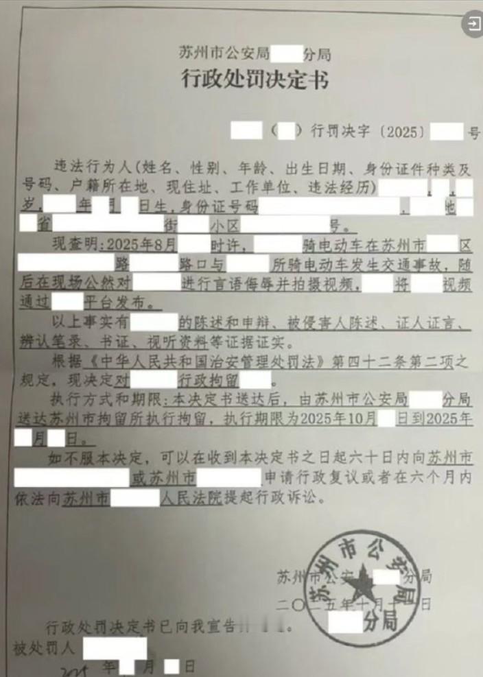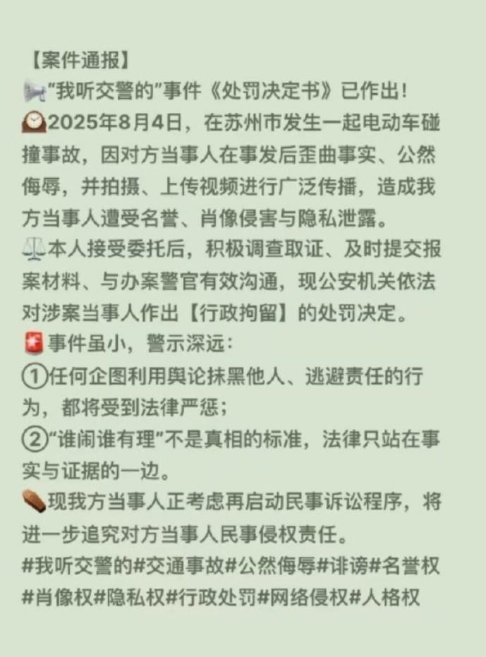 没想到我听交警的事件居然还有后续。 在今年8月,江苏苏州一小伙子骑电动车时与逆行女子发生剐蹭。 明明是女子的问题,她却在当场拍摄视频并反复质问小伙“撞人为何不道歉”“你怎么活到现在”等,试图诱导其认责。小伙全程冷静回应**“我听交警的”**。 交警现场调查后,确认女子逆行负全责,要求双方前往交警大队处理。女子口头答应却中途逃逸 随后,该女子将剪辑后冲突的视频发布到社交平台,歪曲事实并公开小伙未打码的影像及挪车电话,企图引导网暴。 小伙固定证据后于8月14日报警。 就在10月11日,苏州警方做出处罚。 该女子歪曲事实,公然侮辱,并拍摄视频上传进行广泛传播,造成男子名誉受损,隐私侵害! 仔细想想,这件事真的挺可怕的。该小伙子等待交警处理都能被恶意引导,要是回应,是不是更会被抹黑,这就是现在的小仙女吗? 在权益被侵犯后,小伙子很聪明的保留了证据,警方没有和稀泥,这才有了现在的结果。 目前,女子已被收拘,小伙的民事诉讼材料正在准备中。 网络不是法外之地,违法必担责。 法律只保护理性,绝不纵容蛮横