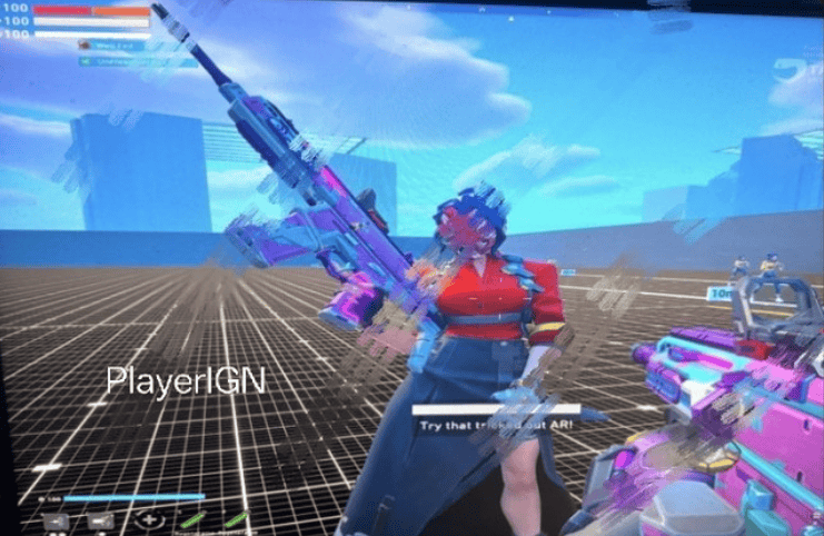被爆料的截图本身显示的是一张网格地图,显然尚未完成,距离标记有着"10米",色彩鲜艳、风格独特的美术风格与无畏契约的风格相近。一个身穿红蓝连衣裙的角色手持一支亮粉色的未来风格式步枪,屏幕上的文字提示写着:“试试这把AR!”