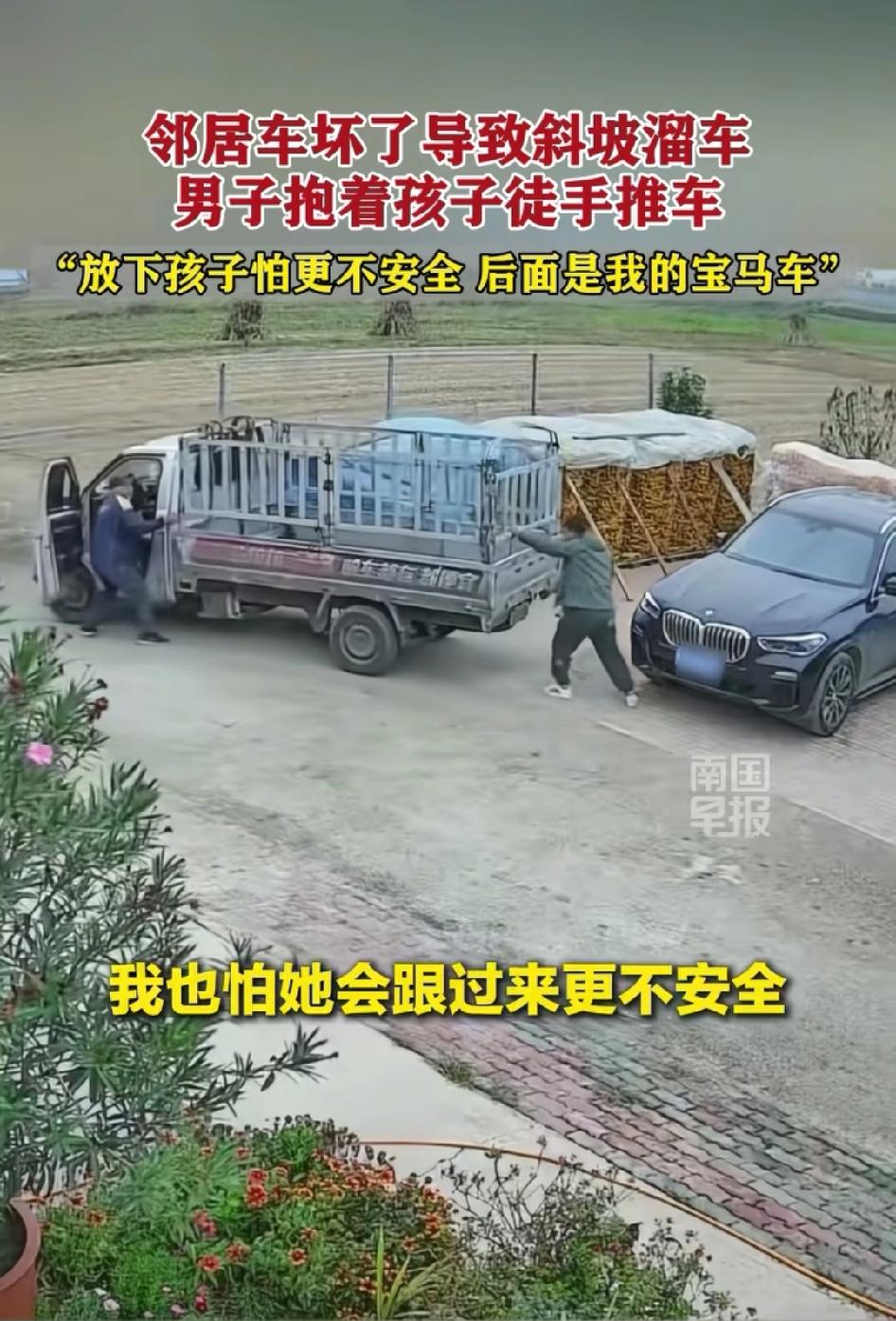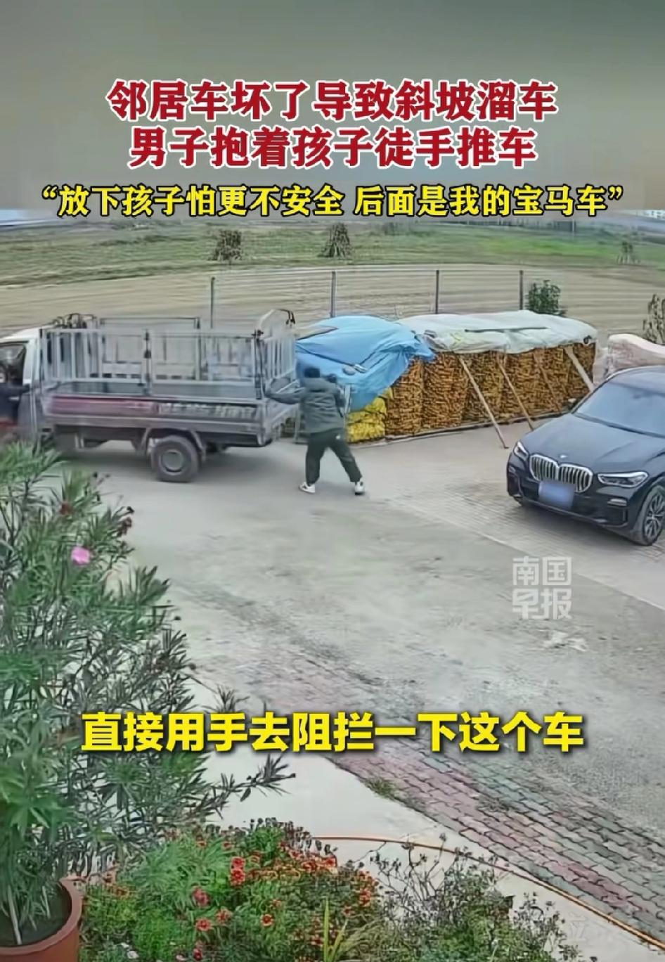 一男子抱着孩子的时候 恰巧看到了一辆车失控 于是就一手抱娃,一手去推车 当时情况紧急 没来得及放下孩子 如果把孩子放下又怕孩子会跟过来到时候更危险 要是不去阻拦一下肯定会撞到后边的汽车 不过还是得以安全为主呀毕竟还抱着小孩子呢 大家说是不是