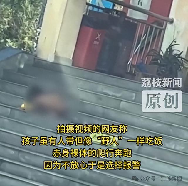 拍摄视频的网友称,孩子虽有人带,但像“野人”一样吃饭,赤身裸体爬行奔跑,因为不放心于是选择报警。