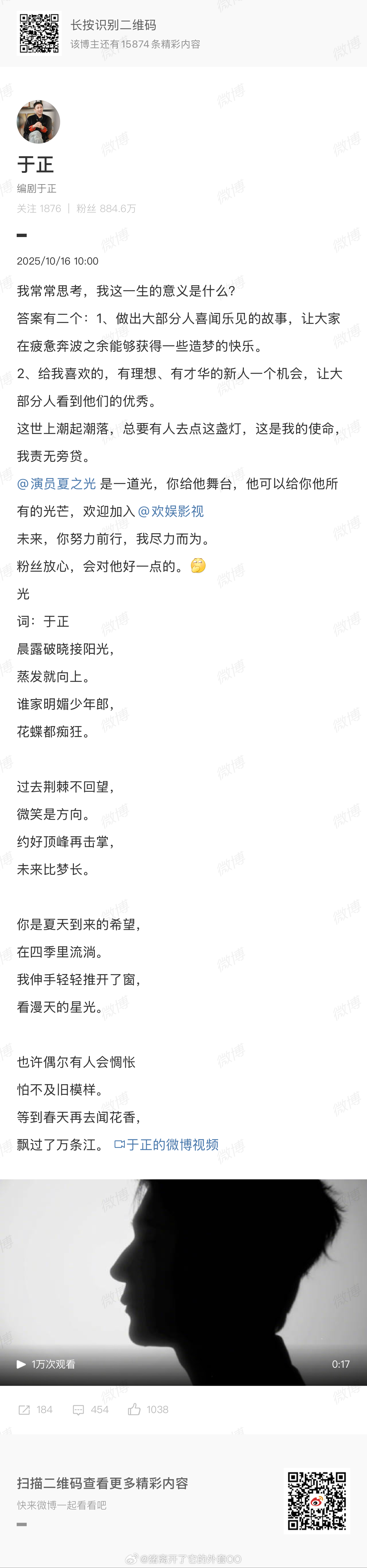于正给夏之光作诗夏之光看来是下定决心做演员了,选择背靠以制作和艺人经纪为主的大公司。期待他解锁更多角色吧![打call]于正 会对夏之光好一点的
