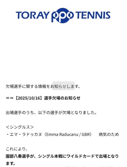 官方发布消息:拉杜卡努因病退出WTA500东京站比赛