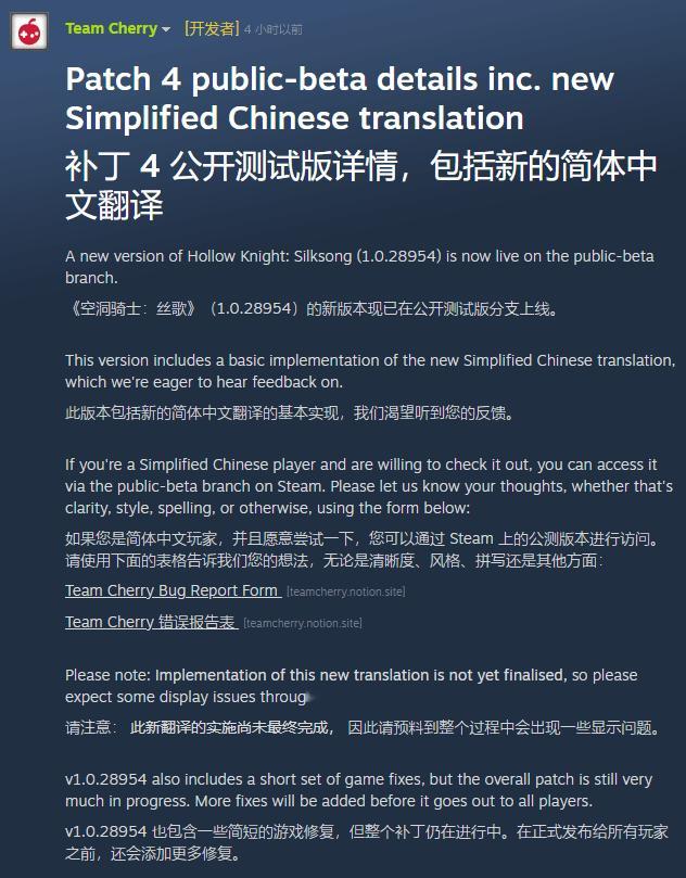 今日,《空洞骑士:丝之歌》全新的简中翻译现已公测分支上线。Team Cherry提示此翻译尚未最终确定还在测试中,因此翻译可能会有些许问题。虽官方提示该简中翻译并非最终版本,但由于新翻译的上线,玩家已经发现了新翻译中的不少问题。