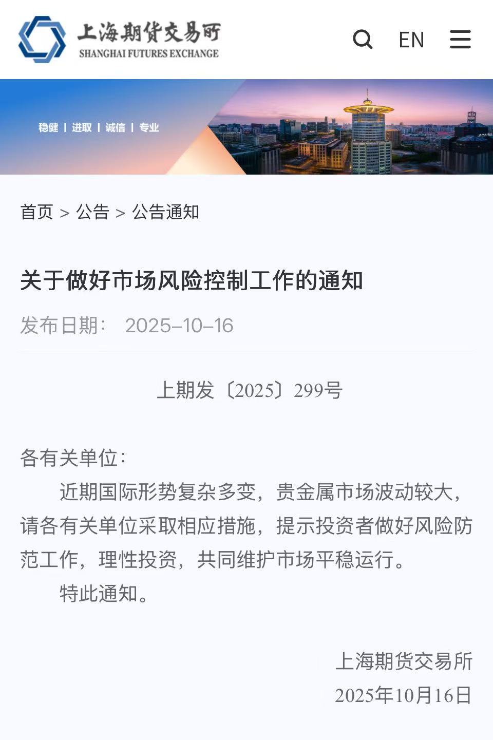 上证报中国证券网讯(记者费天元)10月16日,上海期货交易所发布通知称:近期国际形势复杂多变,贵金属市场波动较大,请各有关单位采取相应措施,提示投资者做好风险防范工作,理性投资,共同维护市场平稳运行。