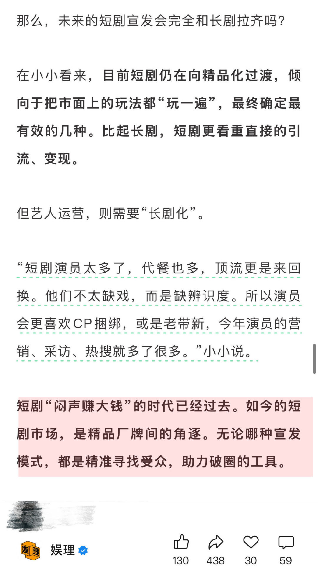 业内谈短剧宣发长剧化 短剧正在复刻长剧的造星模式 2024年下半年开始,免费短剧和精品化时代来临。纯投流无法再“骗”到观众,宣发便成了重要部分。“越精品化的东西,越需要宣发。说白了,公司、演员有代表作,对外议价权就高。一个剧和厂牌出名了,再有新项目,平台更愿意买单,头部演员也愿意来。”娱理独家↓