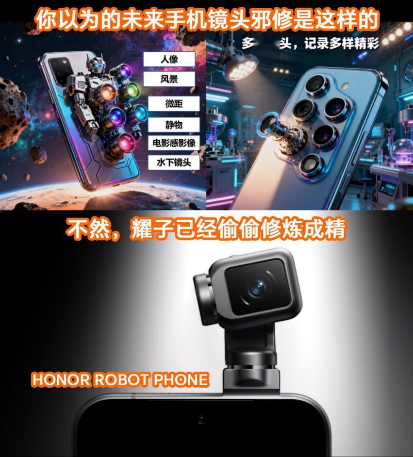 万万没想到,荣耀又丢出来一个新王炸。 本以为荣耀Magic8系列已经足够惊艳,而在发布会结尾荣耀正式官宣了荣耀ROBOT PHONE。此前网上没有任何曝光,可见这款产品的保密程度之高。从正面看,荣耀ROBOT PHONE就是一台智能手机的样子。但是在背面,这款产品的后置镜头模组大不同。它有一颗可以伸缩的镜头,类似于大疆pocket运动相机。这个创新的设计,就让这台手机有了更多想象的空间。比如说塞下更大底的CMOS,实现超级长焦、高清摄像、全景相机等玩法。 而从荣耀官方的预热视频来看,荣耀ROBOT PHONE更多的是将这个伸缩镜头与AI结合在一起,成为一个可以陪伴你左右、能够“看懂”你需求的智慧产品。希望荣耀ROBOT PHONE可以赶快量产。