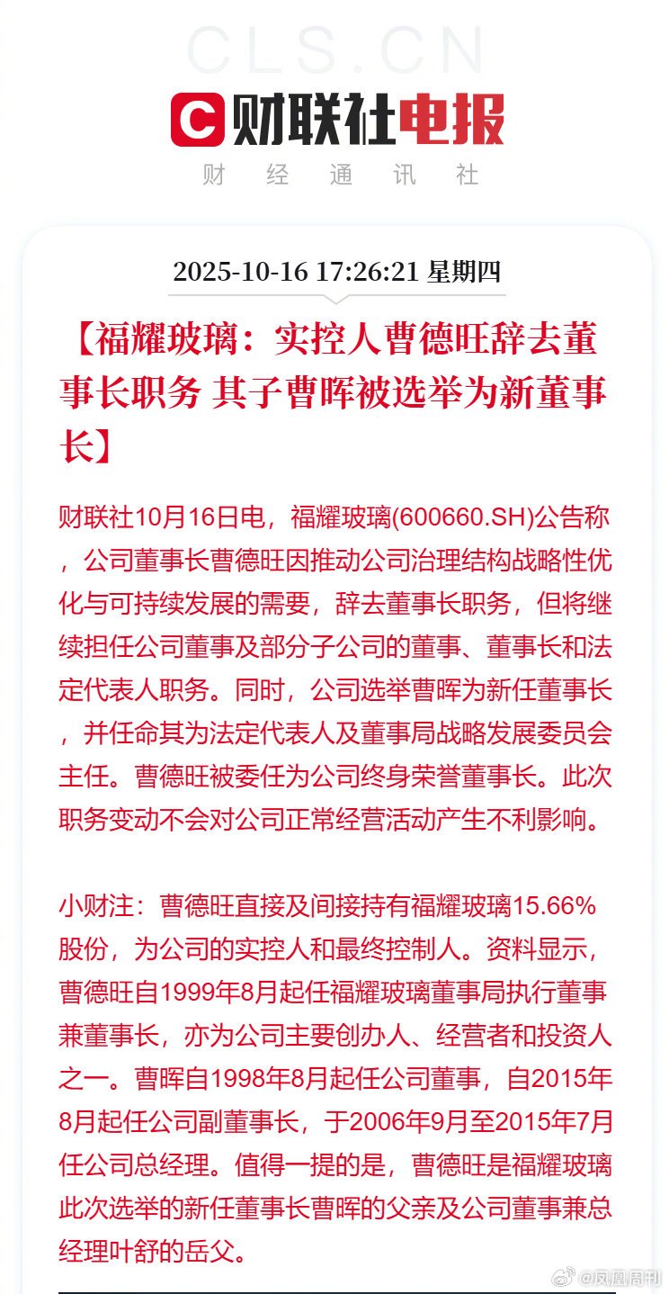 [#曹德旺辞去福耀玻璃董事长职务#]据@财联社APP:财联社10月16日电,福耀玻璃(600660.SH)公告称,公司董事长曹德旺因推动公司治理结构战略性优化与可持续发展的需要,辞去董事长职务,但将继续担任公司董事及部分子公司的董事、董事长和法定代表人职务。同时,公司选举曹晖为新任董事长,并任命其为法定代表人及董事局战略发展委员会主任。曹德旺被委任为公司终身荣誉董事长。此次职务变动不会对公司正常经营活动产生不利影响。