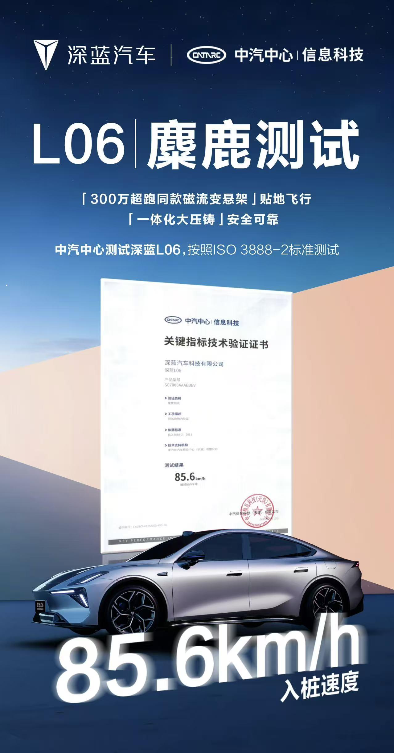 近日,中汽中心麋鹿测试场传来新讯——深蓝L06以85.6km/h的入桩成绩完成挑战,这一数据力压懂车帝麋鹿测试榜此前榜首的保时捷911。测试全程遵循ISO 3888-2国际标准,镜头一镜到底无剪辑,真实呈现了车辆不踩刹车高速变线的避险能力,是场硬核的“真功夫”检验。 为何能跑出这般成绩?核心底气来自京西第四代磁流变悬架。它每秒可完成1000次动态调节,响应速度快至10毫秒(约一次眨眼周期),紧急变线时能瞬间强化车身支撑,将侧倾控制在极小范围。这项常用于高性能车的尖端技术,让20万级科技轿跑深蓝L06的操控更稳、底气更足,也为年轻驾驶者带来了更安心的驾驭体验。 深蓝l06麋鹿测试成绩