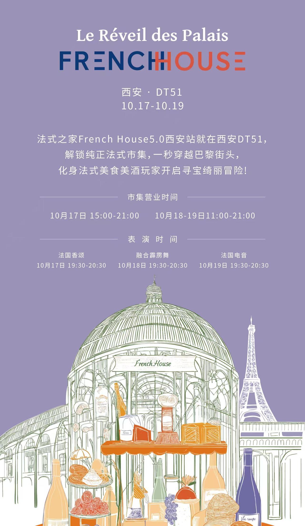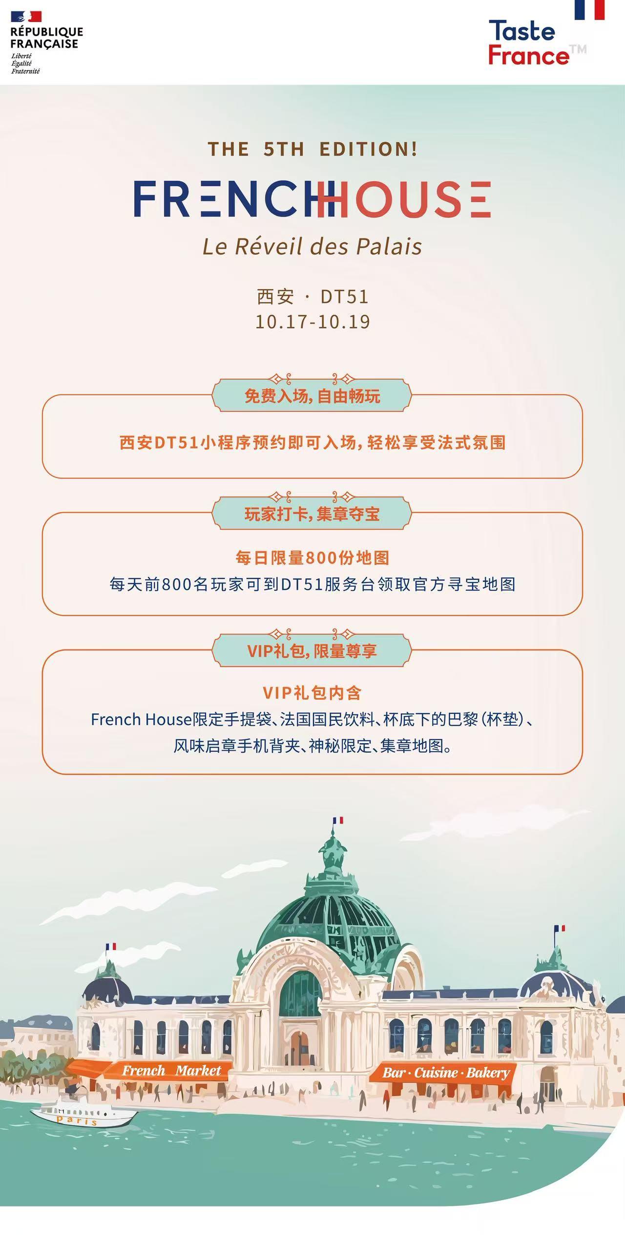 法式之家French House5.0西安站,将于10.17-10.19启幕,用三天限定,营造原汁原味的法式市集,从地道法餐,琳琅满目的精致法甜、馥郁醇香的法国佳酿,到精美餐具与餐桌美学、艺术文创与生活方式,都紧扣“Le Réveil des Palais 风味启章”的精髓,用一场跨越时空的风味与艺术之旅,共筑中法文化对话桥梁。西安生活西安身边事 此次活动,由French House携手战略合作伙伴西安DT51、《精品购物指南》共同打造,并获法国驻华大使馆官方支持,西安法语联盟则为本次活动提供文化支持。 同时,不仅有“波尔多葡园餐桌”、“一口法兰西”、“法式甜蜜时分”三大主题工坊,中国非遗剪纸传承人涂永红亦将受邀亲临,在这里上演跨越时空的对话,让剪纸与法式生活美学并置呈现,焕发出超越想象的艺术魅力。 而著名的乐美雅Luminarc、马琳Malin 、马培德Maped、富隆酒窖Aussino Cellar、Eurial、Soignon与圣安源Abatilles等等,均参与西安站活动。