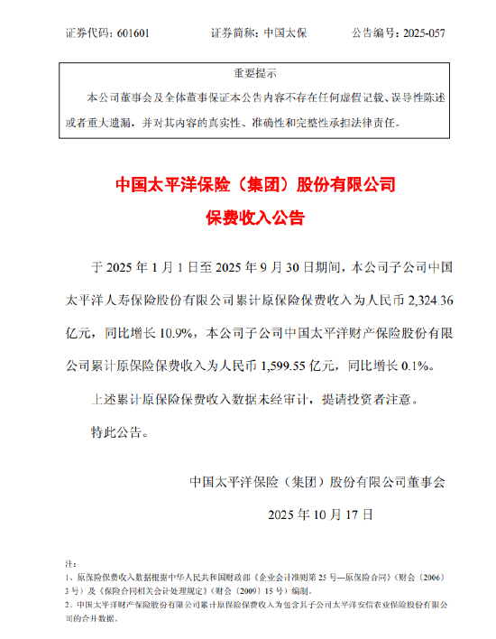10月16日金融一线消息,中国太保(601601/02601)发布公告,报告其子公司中国太平洋人寿保险股份有限公司在2025年1月1日至2025年9月30日期间累计原保险保费收入为2324.36亿元,同比增长10.9%。同时,子公司中国太平洋财产保险股份有限公司的累计原保险保费收入为1599.55亿元,同比增长0.1%。公告中提到的累计原保险保费收入数据未经审计。
