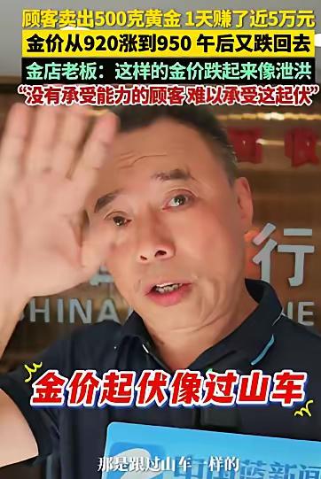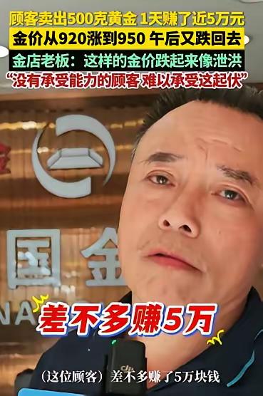 这人运气有点好。 杭州一顾客买入500克黄金,隔日卖出赚了五万。金店老板说当天金价从920涨到950又跌回920。这种波动多数人难以把握。 黄金短线操作像赌运气。有人跟风买入结果被套,急着用钱只能亏本卖出。价格受国际形势影响,普通人很难预测准确。投资黄金需要长期眼光,短期追高存在风险。