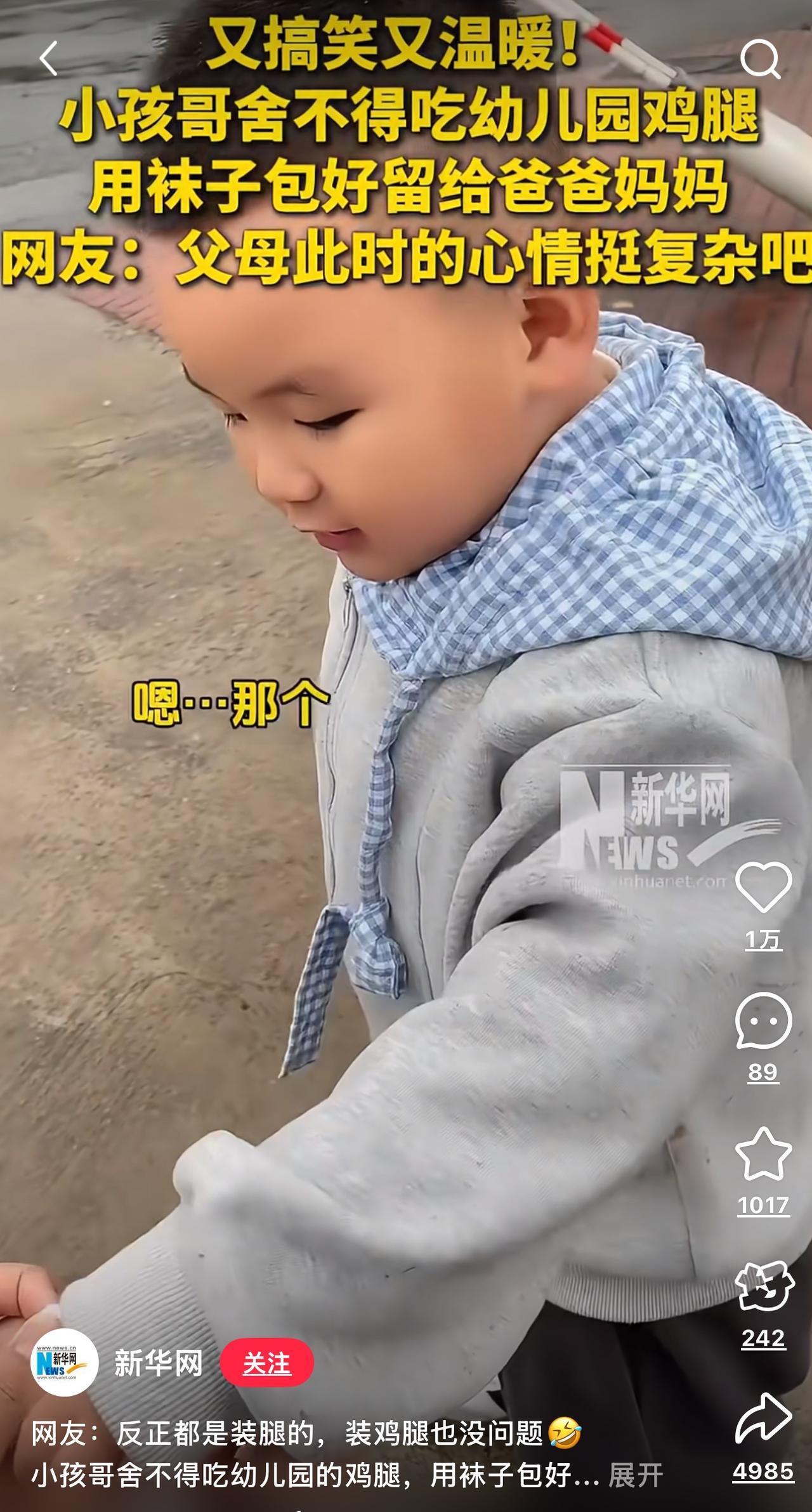 谁能想到啊!人民日报都点赞的暖心事儿,居然是个三岁娃干的! 幼儿园放学蹦得比兔子还欢,一见到爸爸就掏书包,摸出只白袜子——里面居然裹着个油乎乎的鸡腿! 你说逗不逗?袜子装鸡腿听着离谱,可娃一句“学校的,没吃,留给爸妈”,瞬间就把人戳软了。后来还惦记着“给妈妈留一点”,这小模样哪是三岁,分明是揣着颗小太阳在疼人。 网友说“好多大人不如娃”,这话真没说错。我们总想着用漂亮包装、贵重礼物表达爱,却忘了最打动人的,是“有好东西先想着你”的本能。娃没找着袋子就用袜子,这份不掺杂质的心意,比任何精致礼盒都金贵。 你家娃或者你小时候,有没有过这种“笨笨的贴心”?评论区说说,让大家都沾沾这份甜~