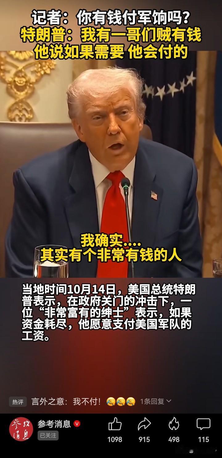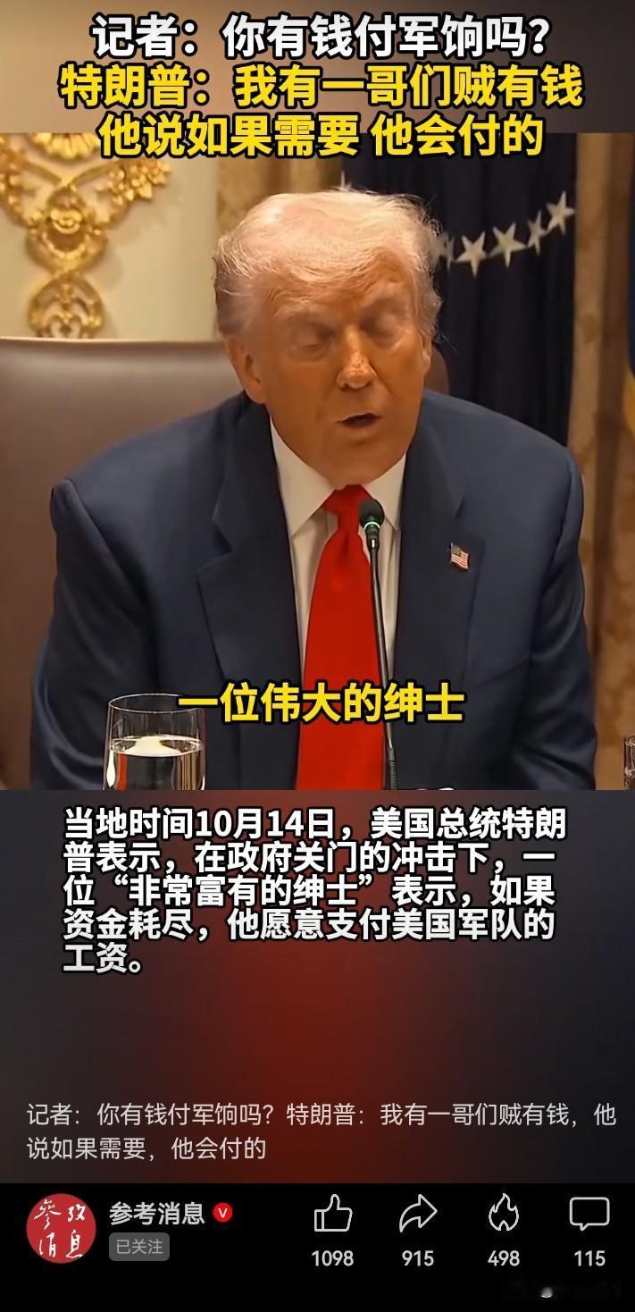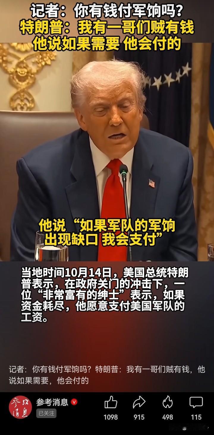 强大的美军,竟然要闹到没有钱发饷银了?!只是,这个要给军队发工资💰的人,听说过朱元璋和沈万三的故事吗? 从我们国庆节开始,那时候美国联邦政府就停摆了,很多雇员都停了工资💰,据说特朗普还要炒掉一些人以节约开支! 这样看,对军队这些天一直是硬支撑着,毕竟是国家暴力机器嘛。 又有消息说,现在他们是在用研发经费来发饷银…… 记者问,你还有钱在10月15日给军队发工资吗? 特朗普则表示,如果有必要的话,有个富豪愿意给军队发工资…… 这也是又刷新记录了。只是他说的这个贼有钱的哥们,是马斯克吗? 马斯克曾经因帮特朗普竞选总统,后来有过一段和特朗普关系很好的时光。只是,后来好像两人又发生了矛盾。现在也很少把两人一起提起了。 无论是谁,或许他可以学习一下中国历史,明太祖朱元璋和明朝首富沈万三的故事。 据说当年,明太祖朱元璋定都南京,却没有钱修建城墙,首富沈万三为了向朱元璋示好,主动提出帮朱元璋修建城墙,并且犒赏三军。 为此,他犯了朱元璋的禁忌,后来被流放充军……