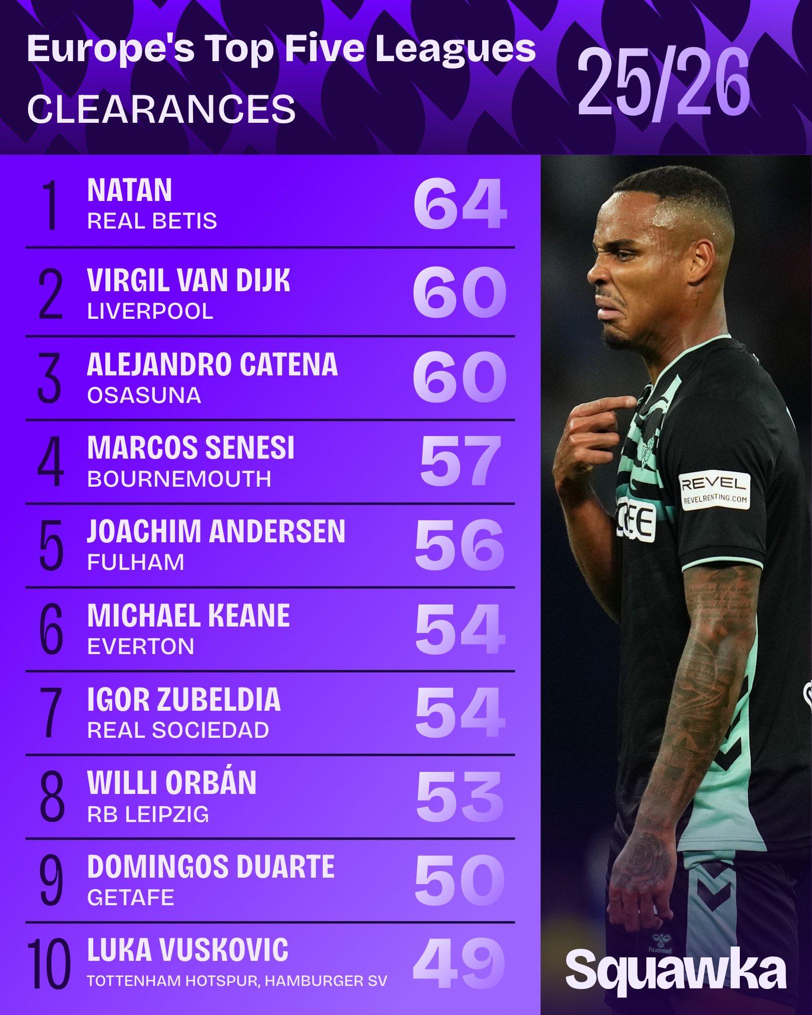 虎扑10月16日讯Squawka数据统计本赛季至今五大联赛解围榜,贝蒂斯中卫纳坦64次居首,范戴克并列第二。