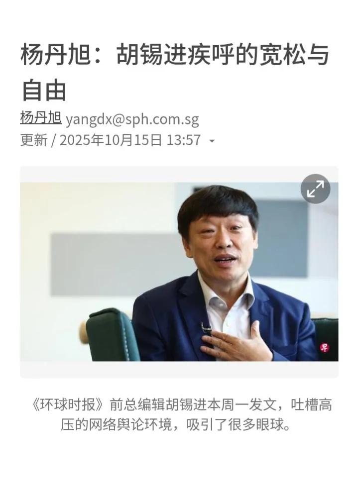 新加坡官媒记者杨丹旭发文:“胡锡进疾呼的宽松与自由。” 一个人喜欢“递枪”,另一个人喜欢“捡枪”配合的十分默契。 大多数中国人没有胡的闲情逸致,没有工作的,找工作或创业,有工作的,加倍努力。 事业单位人退休,有足够的退休金,有足够的闲情逸致,有房,有车,自然体会不到平民百姓的需求,曲高和寡。 这类“网红”与百姓脱节,与现实脱节,发表一系列意见,“红一阵”,一天又过去了。
