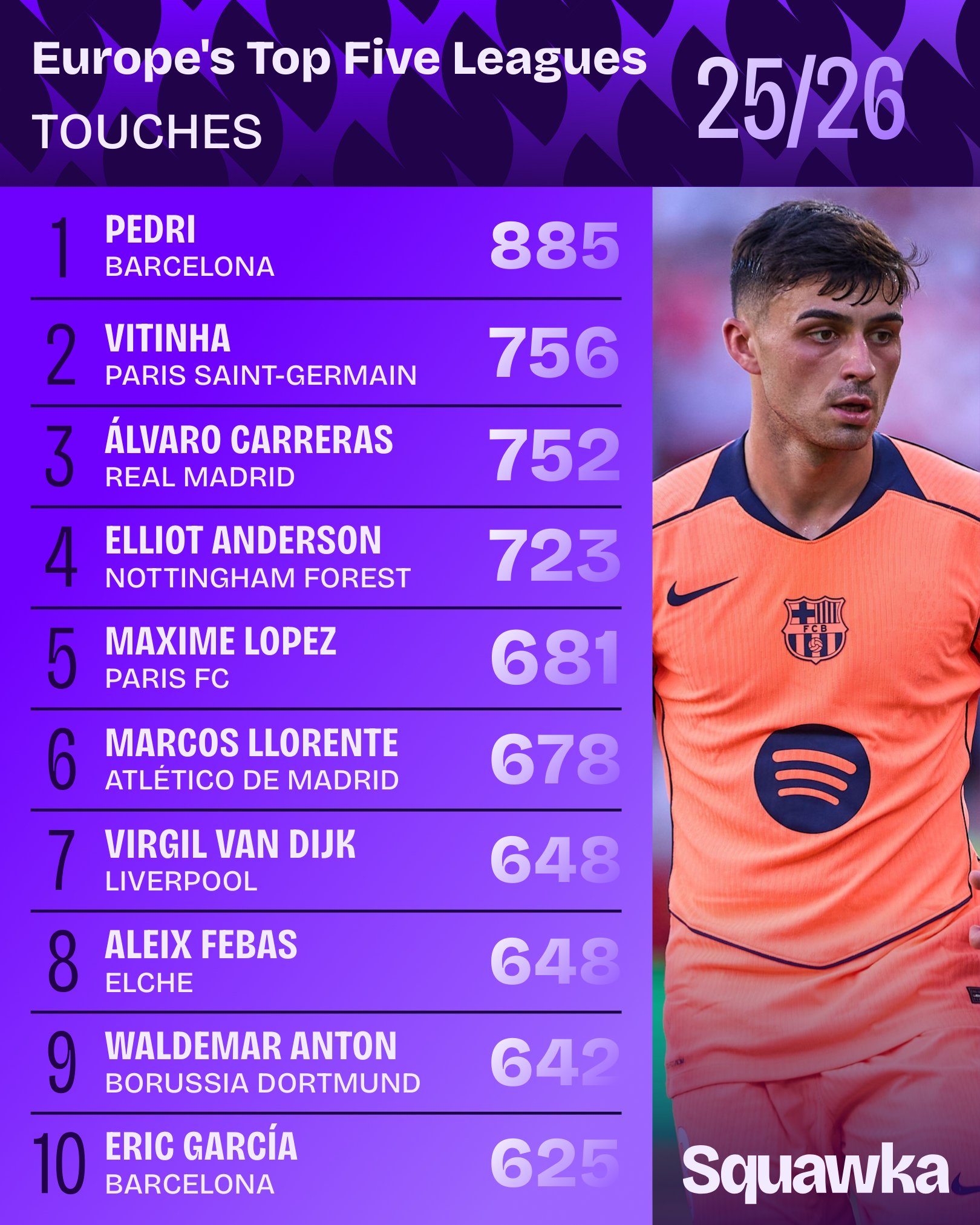 虎扑10月16日讯Squawka数据统计本赛季至今五大联赛触球榜,佩德里885次居首。