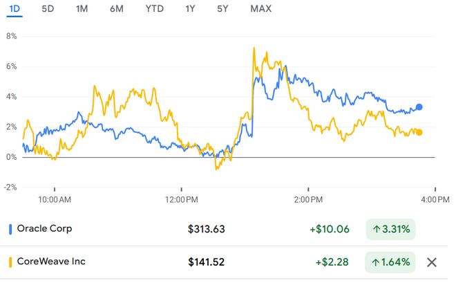 这一数据披露后,市场对AI基础设施业务盈利能力的信心增强,甲骨文股价一度上涨超5%、随后涨幅回落,同时也带动同行业公司CoreWeave股价上扬。