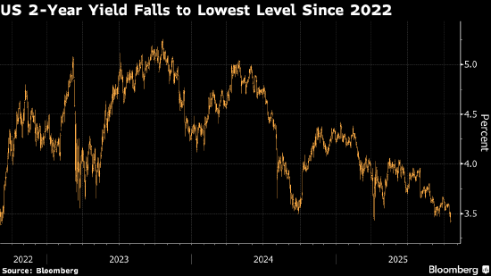 两年期国债领涨,因相较于长期债券,该品种国债对美联储政策利率的预期变化更为敏感。受此影响,交易员已充分消化了美联储今年余下两次会议中每次降息25个基点的预期。