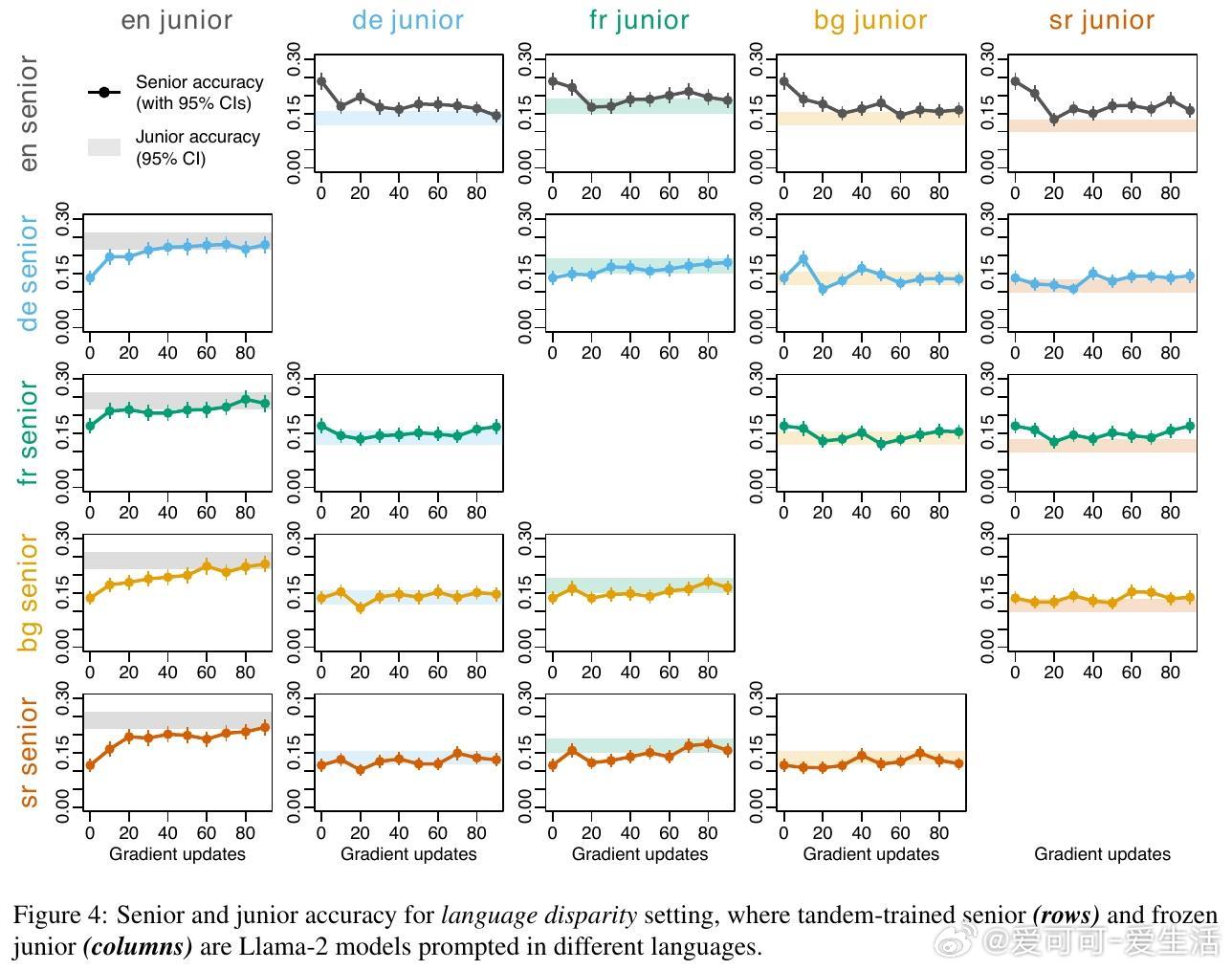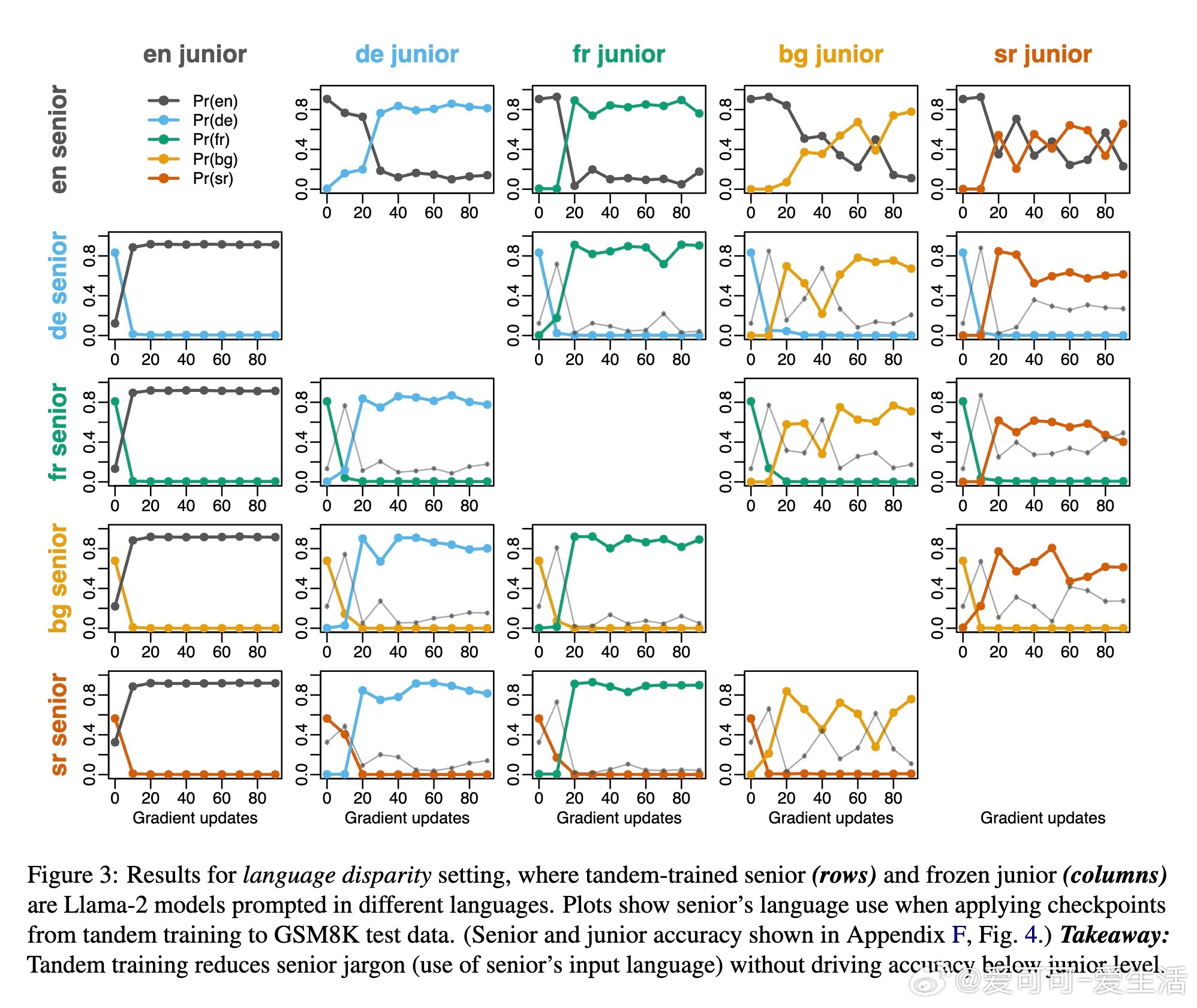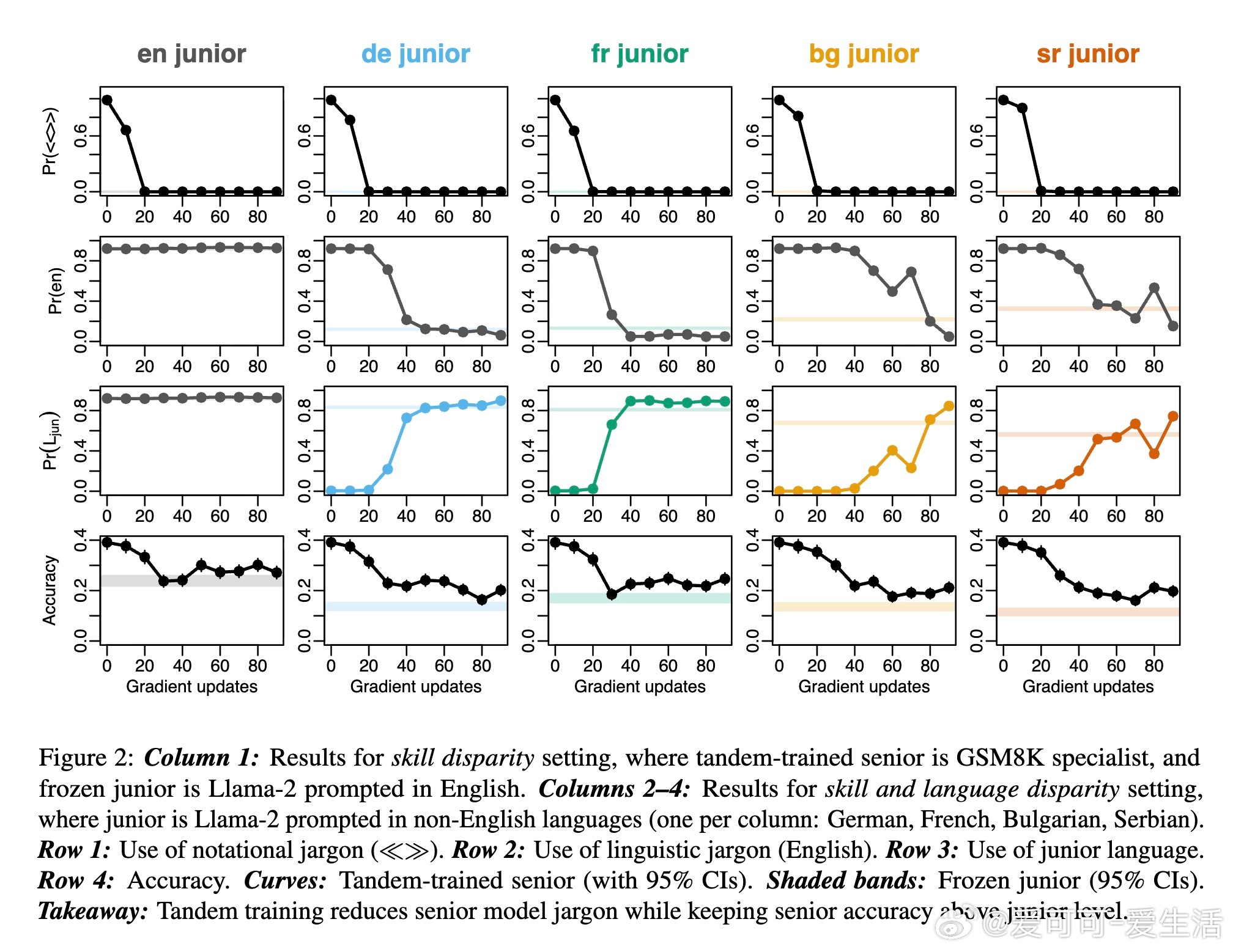 - 在数学推理任务GSM8K上,串联训练使高级模型快速舍弃专业符号和术语(如算式中的“≪ ≫”符号),语言表达向低级模型习惯的语言靠拢。