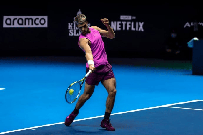虎扑10月17日讯沙特六王大满贯网球表演赛半决赛,世界第一阿尔卡拉斯6-4、6-2战胜世界第四弗里茨,连续两年打进决赛。