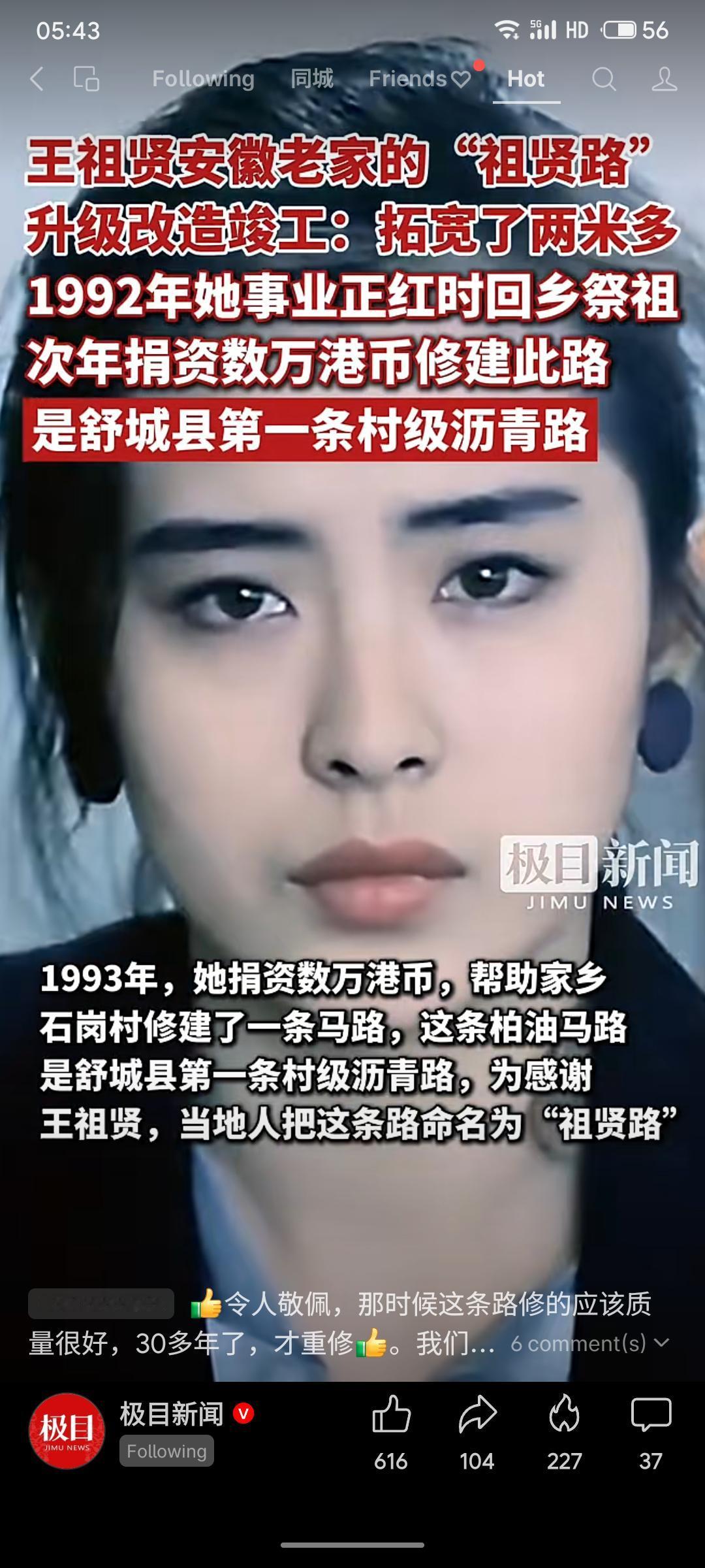 影星王祖贤于1993年捐资数万港币为安徽舒城老家修建了全县首条村级沥青路,该路被命名为“祖贤路”。近日,这条承载乡情的道路已完成升级改造,路面拓宽了两米多。