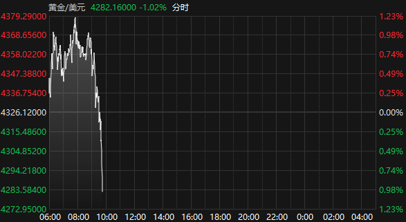 上证报中国证券网讯据Choice数据,10月17日,国际现货黄金冲高至4379.29美元/盎司后短线下挫,截至9:45报4282.16美元/盎司,日内跌超1%。