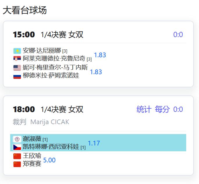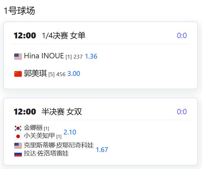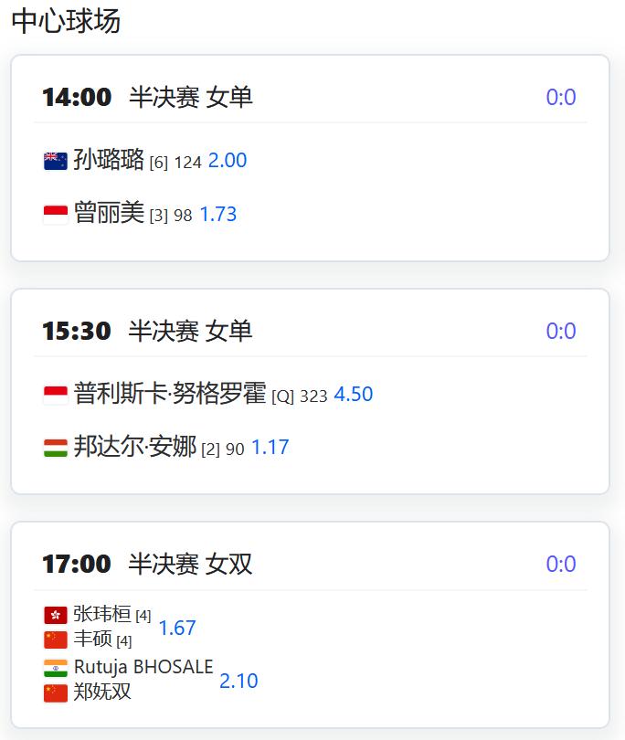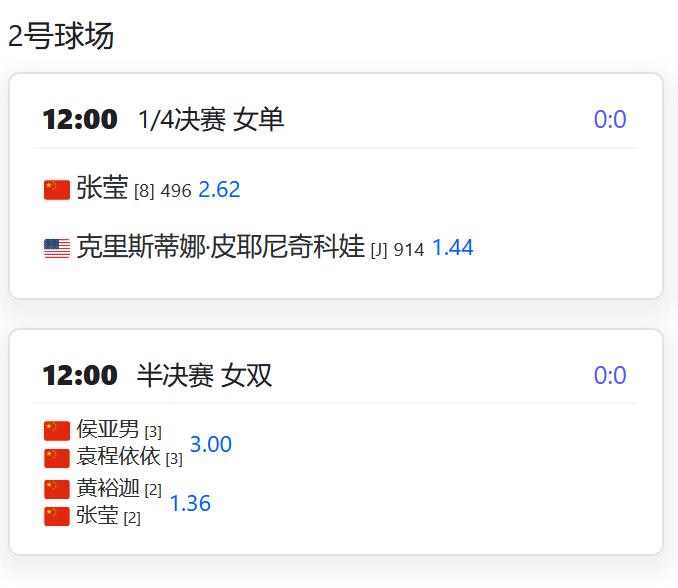 今日赛程: WTA500赛宁波站,女单四分之一决赛,朱琳将在夜场迎战7号种子施耐德; 女双四分之一决赛,郑赛赛/王欣瑜退赛,保送谢淑薇/西尼亚科娃晋级四强; W125济南,女双半决赛,丰硕/张玮桓将与郑妩双/博萨尔争夺一个决赛席位; CH75深圳,四名中国球员包揽上半区八强席位,确保一个决赛名额: 莫业聪将对阵崔杰,孙发京对阵周意,两组的胜者将争夺一个决赛席位。 W35湖州,女单四分之一决赛,郭美琪将对阵头号种子INOUE; 张莹将对阵青少年球员皮耶尼奇科娃; 王佳祺将对阵资格赛球员库巴列娃; 女双半决赛,侯亚男/袁程依依对阵黄裕迦/张莹。
