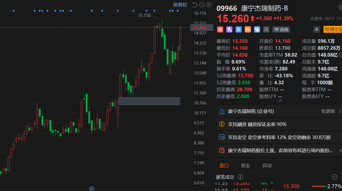 港股生物科技股逆势上扬,其中,康宁杰瑞制药-B(9966.HK)大幅上涨超11%,现报15.26港元,总市值148亿港元。