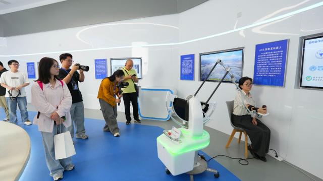 步入研究院,“求是创新”的浙江大学校训格外醒目。工作人员首先介绍了研究院的基本情况,并详细讲解了浙江大学光电学院的概况。步入环形布局的展厅,采访团开启了一段沉浸式科技体验。大家纷纷试戴了AI智慧眼镜,只需轻声说“小溪小溪,拍照”,眼镜便应声完成拍摄,响应迅捷。随后,大家还依次体验了骑行AR眼镜、工业场景AR眼镜,以及AR上肢康复机器人等多款创新产品,切身感受了“光电+AI”技术带来的变革性应用。