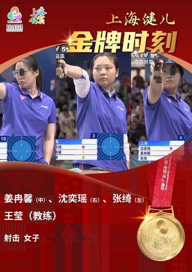 在10月16日进行的全运会射击项目女子10米气手枪个人决赛中,姜冉馨为上海队夺得一枚铜牌。另一名上海选手张绮获得第六名。同时在团体赛资格赛中,姜冉馨、张绮、沈奕瑶组成的上海队以1745环的总成绩超越中国队在2025年射击亚锦赛中创造的1740环的团体世界纪录。今天上午进行的全运会射击项目女子10米气手枪团体决赛金牌赛,规则是“抢16”,比赛在上海队与河北队之间展开。第一轮,上海队先得2分,随后河北队将比分追平。之后,河北队连续得分,以6:2领先。上海队随即叫了一个暂停,暂停回来后上海队迅速调整状态,连续六轮得分,比分来到14:6。河北队扳回2分后,上海队一鼓作气,以16:8夺得冠军。上海队最终力压河北队,射下这枚沉甸甸的金牌。