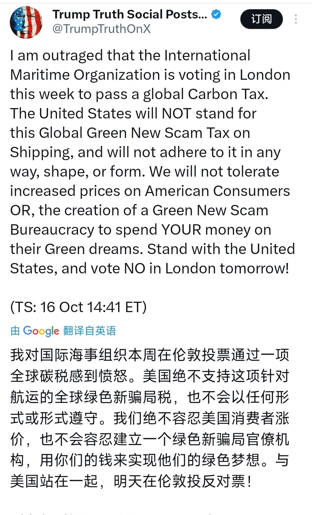 美国总统特朗普今天(北京时间10月17日)发文写道:“我对国际海事组织本周在伦敦投票通过一项全球碳税感到愤怒。美国绝不支持这项针对航运的全球绿色新骗局税,也不会以任何形式或形式遵守。我们绝不容忍美国消费者涨价,也不会容忍建立一个绿色新骗局官僚机构,用你们的钱来实现他们的绿色梦想。与美国站在一起,明天在伦敦投反对票!” [机智]评几句:特朗普这段文字,活脱脱是霸权思维的又一次“大秀”。所谓“全球绿色新骗局税”,不过是特朗普为了维护美国利益、逃避国际责任找的荒诞借口。国际海事组织推动全球碳税,本是为应对气候危机,是全人类共同的事业。特朗普却只盯着美国消费者那点利益,把国际合作污蔑为“骗局”,还要求他国跟着美国“站队”,完全是强盗逻辑。美国作为全球碳排放大国,不思承担责任,反而阻挠,这种短视自私之举,只会让美国在国际舞台上愈发孤立,沦为全球生态治理的“绊脚石”。