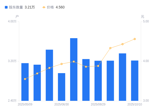 近一年(2024年10月10日至2025年10月10日),法尔胜A股股东户数从3.49万户,减低至3.21万户,降幅7.97%,区间股价上涨45.22%。