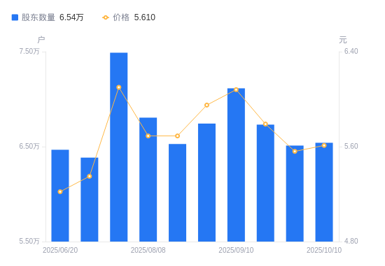 日期A股户数(户)流通A股户均持股数(股)户均持股市值(万元)2025-10-106540117505.899.822025-09-306511117583.869.782025-09-196731217008.899.852025-09-107113916093.889.792025-08-296742416980.6410.102025-08-206528317537.539.982025-08-086805316823.699.572025-07-317489715286.369.322025-06-306383417935.629.602025-06-206467316613.428.67