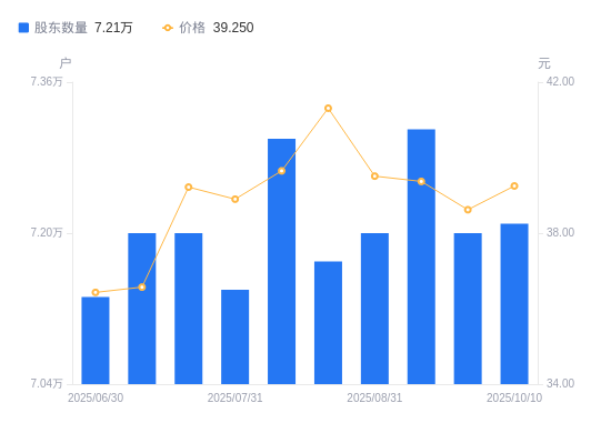 日期A股户数(户)流通A股户均持股数(股)户均持股市值(万元)2025-10-10721006439.4925.282025-09-19720006582.8025.422025-09-10731006483.7525.532025-08-31720006581.2226.002025-08-20717006608.7627.302025-08-10730006491.0725.742025-07-31714006636.5225.822025-07-18720006581.2225.812025-07-10720006581.2224.072025-06-30713246643.6024.20