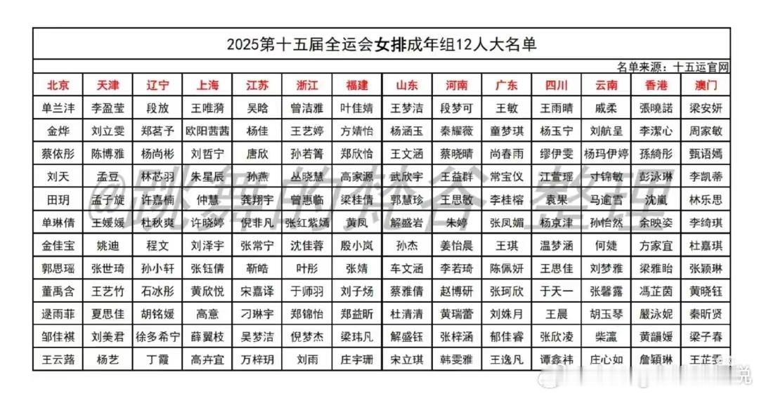 2025全运会 女排成年组名单全部出炉,袁心玥没有代表天津队,朱婷代表河南队参赛,江苏周页彤没进名单。