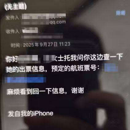 随后,“闺蜜”在聊天中透露,自己正在国外,近期计划回国,因不方便操作国内购票平台,希望徐女士帮忙购买机票。出于对“闺蜜”的信任,徐女士立刻答应帮忙。紧接着,“闺蜜”发来一个电子邮箱地址,称已联系好“客服经理”,让徐女士通过该邮箱与对方对接购票事宜。