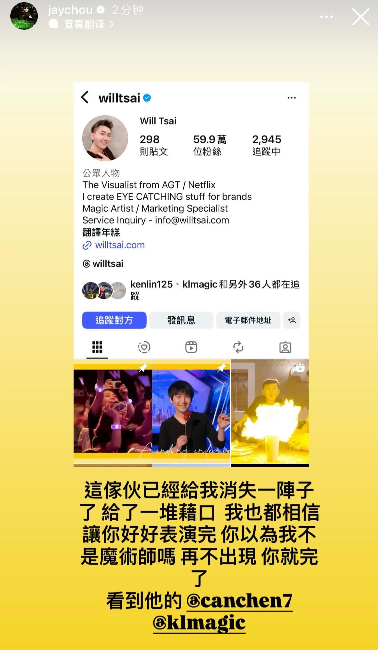 周杰伦:有谁看到这位把自己也变不见的魔术师蔡威泽通知我一下。感觉好生气的样子