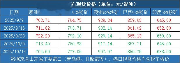 新华财经北京10月17日电(郑豪)据新华指数研究院监测,截至10月14日,新华·山东港口62%澳大利亚粉矿价格指数报938.09点,较10月9日下跌4.73点,跌幅0.50%;新华·山东港口63%澳大利亚块矿价格指数报881.85点,较10月9日下跌8.91点,跌幅1.00%;其它铁矿石指数及价格变动情况详见表格。