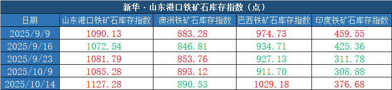 截至10月14日,新华·山东港口铁矿石库存指数报1127.28点,较10月9日上涨42.00点,涨幅3.87%。