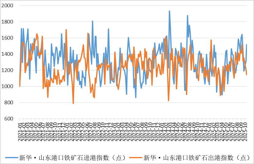 截至10月14日,新华·山东港口铁矿石进港指数报1518.04点,较10月9日上涨200.04点,涨幅15.18%;新华·山东港口铁矿石出港指数报1146.13点,较10月9日下跌56.75点,跌幅4.72%。