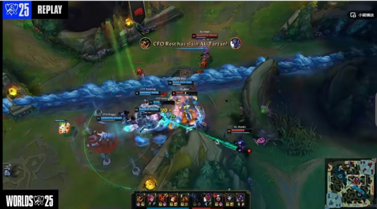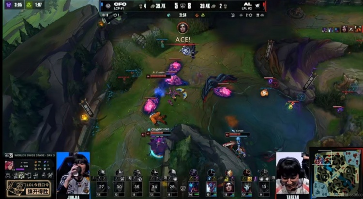 [21:40]CFO开打厄塔汗,但是HongQ岩雀被开残血,正面Doggo女枪大招效果一般,Rest鳄鱼进场也被集火先被Flandre雷克塞击杀,随后Flandre雷克塞击飞三个,Tarzan巨魔抢到厄塔汗!残局Flandre一个大招切死Doggo女枪!AL完成对CFO的团灭,随后野区又逮捕Kaiwing泰坦之后拿下听牌龙!AL经济反超!