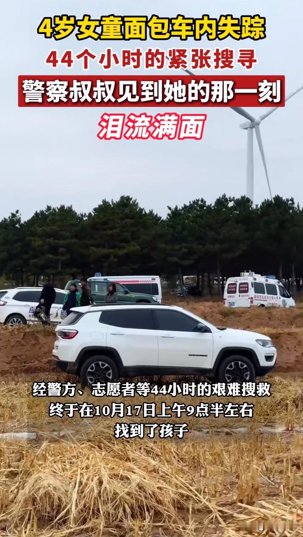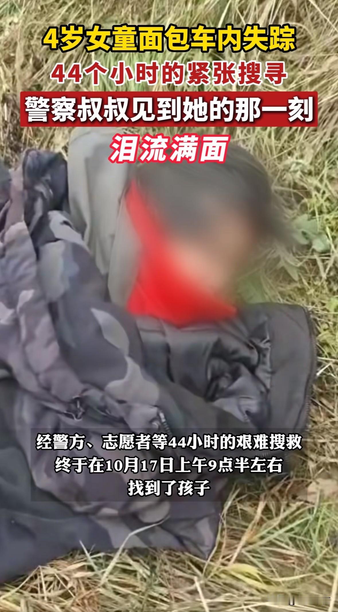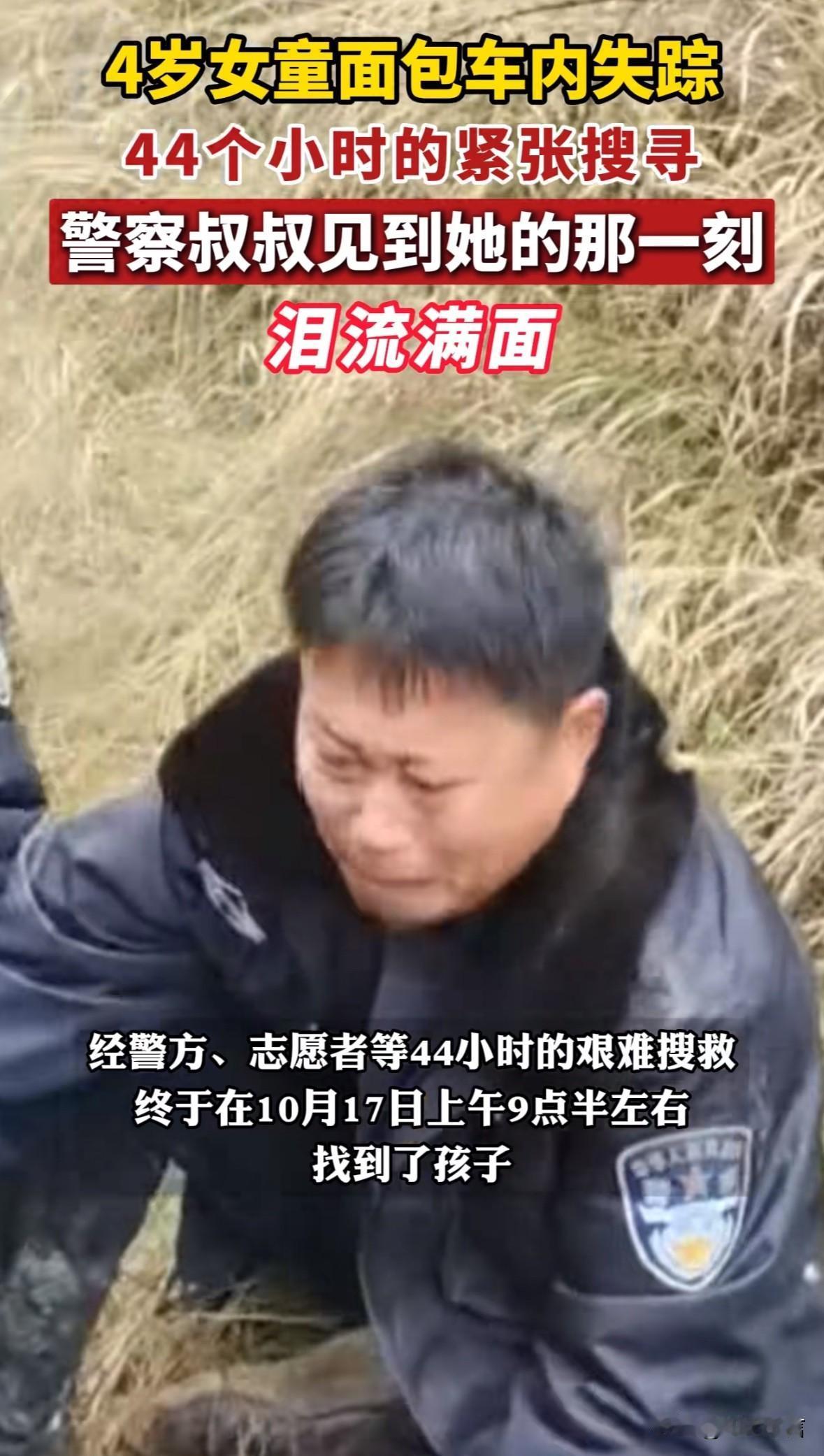 感动!4岁女童面包车内失踪,历经44小时找到,民警现场难以抑制激动的泪水 辽宁朝阳的一名四岁女孩随爷爷奶奶去田间干活,因为睡着了,所以被爷爷奶奶留在了面包中睡觉,谁想干完活后爷爷奶奶却在面包车里没看到女孩 然后爷爷奶奶报警,众多救援力量马上投入到了搜寻中,经历了一夜后终于在44小时后找到了女孩,是在一个山洞中找到的,因为前一晚在下雨,小女孩非常聪明,知道去山洞里躲雨 在众人高兴之余,一位民警难掩激动的心情,流出了欣慰的泪水,既是为女孩的幸运感到高兴,也是为众人齐心协力的结果而感动 给这位正义的民警点赞👍