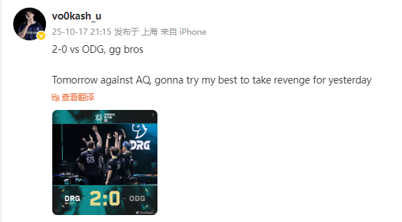 虎扑10月17日讯2025VCTCN联赛晋升赛淘汰赛,DRG以2-0的比分战胜ODG,挺进下一轮。赛后,vo0kashu发文: