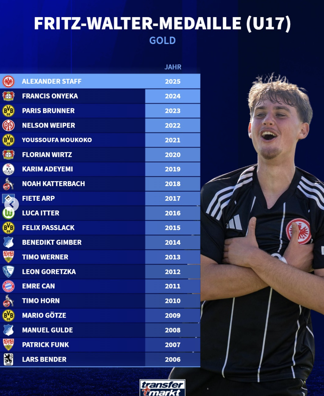 法兰克福的斯塔夫获得了2025年U17年度最佳新秀。