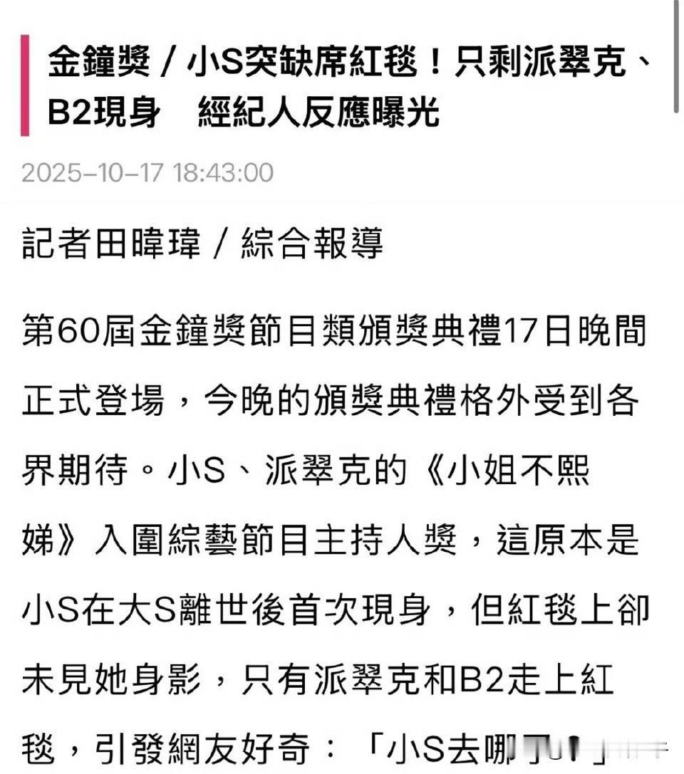 金钟奖大屏幕播放大S影像,具俊晔看到估计又要伤心了! 10月17日,第60届金钟奖红毯,众多明星纷纷亮相,给观众带来一场视觉盛宴,然而,当大屏幕上播放大S影像时,很多网友留言表示非常难过。 不得不说,金钟奖这段影像设计的很用心,缅怀逝者,以及曾经出演过的经典角色,可见大S曾经的地位和知名度。 据媒体报道,小S缺席金钟奖红毯,不知道是否害怕看到缅怀大S的环节,触景生情,勾起回忆。 如果具俊晔看到这个画面,估计又要伤心了,前段时间,有粉丝去悼念大S,遇到欧巴在墓地守护爱妻,手里拿着平板,眼尖的网友认出画面中正在播放《流星花园》,显然还没有从悲痛中走出来。 说实话,作为路人,看到大屏幕播放大S的画面,有种莫名的悲伤,感觉太可惜了。 话说,如果大S尚在,应该也是金钟奖的座上宾吧!