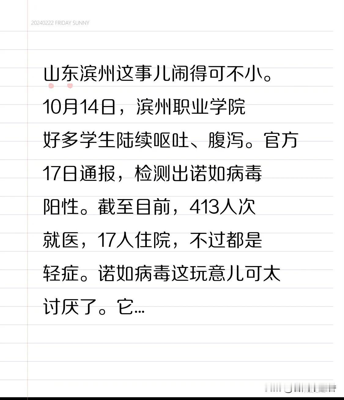 山东滨州这事儿闹得可不小。10月14日,滨州职业学院好多学生陆续呕吐、腹泻。官方17日通报,检测出诺如病毒阳性。截至目前,413人次就医,17人住院,不过都是轻症。 诺如病毒这玩意儿可太讨厌了。它致病能力强,极少量病毒就能让人感染,一个感染者一次能排出数十亿个病毒粒子。生存能力也强,0℃ - 60℃都能存活,酒精和免洗洗手液还灭不掉它,而且全人群都易感。好在学校和相关部门反应快,病例监测、消杀、宣教等工作都在有序开展,希望学生们都能快点好起来。