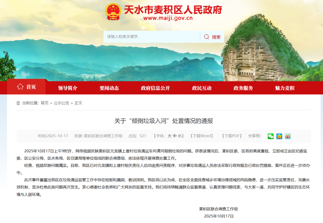 10月17日,甘肃省天水市麦积区联合调查组发布关于“倾倒垃圾入河”处置情况的通报: