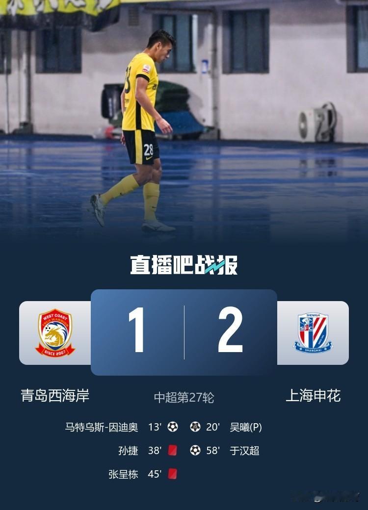 今晚,青岛西海岸在主场与上海申花的比赛中,面对球队被连续岀下两个人的不利情况下,球队以1:2不敌上海申花! 邵佳一在球队少两个人,同时又是一球落后的情况下 ,骨子里不服输的精神依然显露无异!在第八十九分钟,邵佳一在场边依然作出让球队压出来进攻的手势!而在随后的伤停补时阶段!青岛西海岸的防守反击仍然让上海申花防守一度风声鹤唳!差点扳平了比分! 说实话,今晚的上海申花如果不是在人数多两个人的话!上海申花极有可能被青岛西海岸扳平!甚至有反超的可能!而上海申花在多两个人的情况下,进攻总是只开花不结果!如此状态的上海申花,真的可能离中超联赛冠军渐行渐远了!