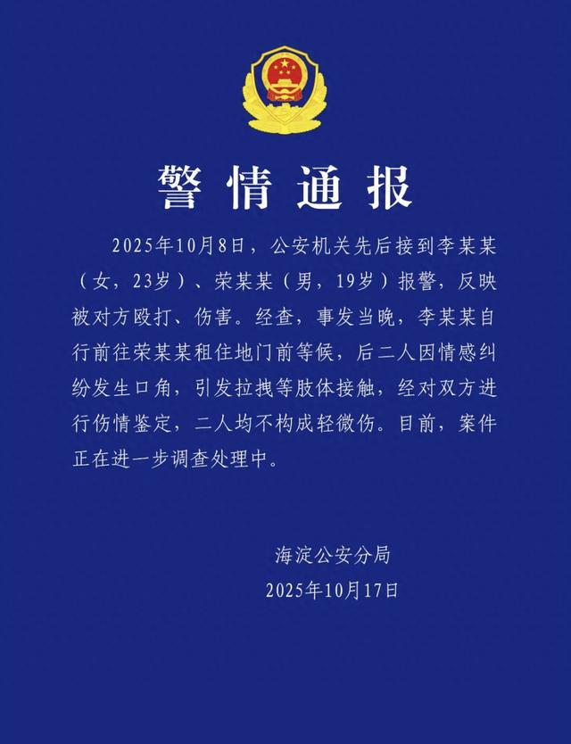 北京海淀警方通报:李某某、荣某某因情感纠纷,引发拉拽等肢体接触