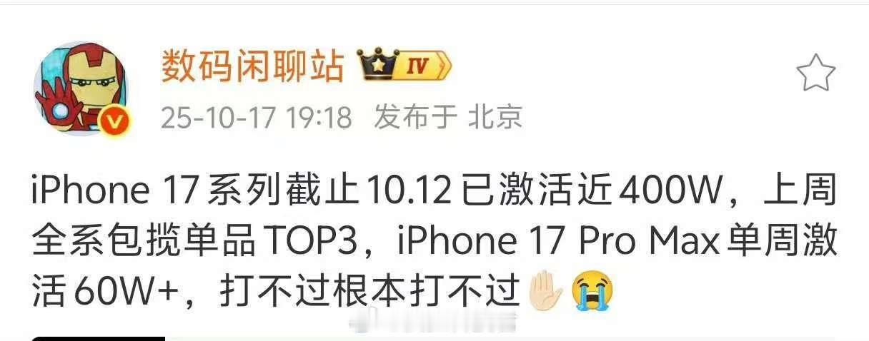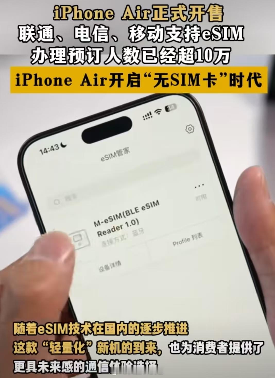 iPhone 17系列截止10.12激活近400万,Pro Max单周就卖60万+,这销量简直是“降维打击”。这边iPhone Air又来搞事情,开启“无SIM卡”时代,预订人数超10万,联通、电信、移动还都支持eSIM。